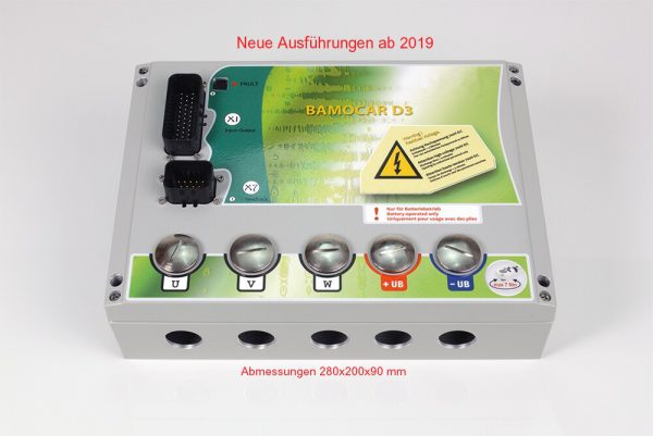 Batterie-Motorregler mit Servo-Performance für bürstenlose Servo- und Asynchronmotoren bis 340 kW, HV-Isolation, potentialfreie Elektronik. Zur Anwendung in batteriebetriebene Fahrzeugen wie Elektrofahrzeuge, Elektroboote, Stapler, Transportsysteme oder Regalförderfahrzeuge im rauen Einsatz, besonders als 4Q Servoantrieb, bei hochdynamischen Beschleunigungs oder Bremsvorgängen, bei großen Regelbereichen, bei hohem Wirkungsgrad, bei kleinen Motorabmessungen, bei gleichmäßigem, ruhigem Lauf für die Drehmomenten- und Drehzahlregelung oder kombinierte Drehzahl – Drehmomentregelung mit oder ohne überlagerter Lageregelung. Synchro Servo Antriebe sind kompakter als andere elektrischen Antriebe. Motorempfehlung: Baureihe GVM