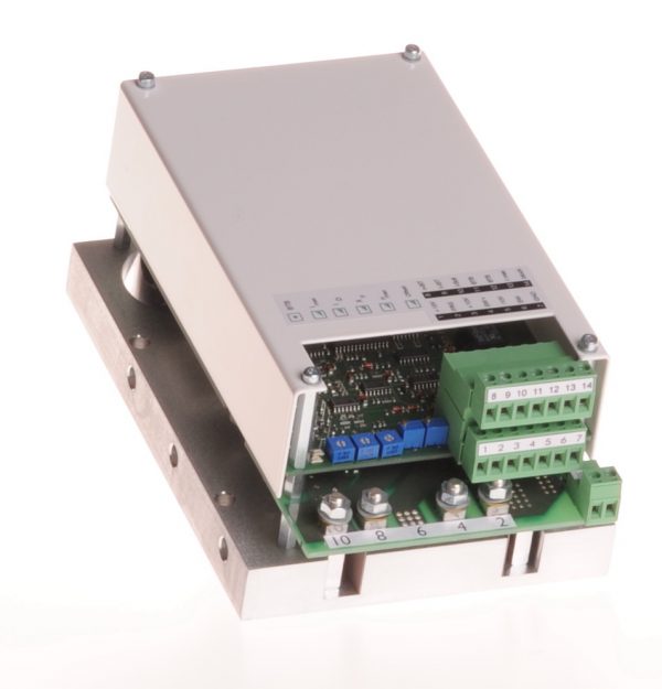 Batterie-Motorregler für die Strom- und Drehzahlregelung von bürstenbehafteten DC-Motoren, permanent oder Nebenschluß bis 22 KW. Beim Gleichstrommotor ist der Strom proportional zum Drehmoment und die Spannung proportional zur Drehzahl. Strom und Drehzahl werden exakt gemessen. Die analogen Regelkreise des Servo- Verstärkers sind einfach aufgebaut, dadurch ergibt sich eine hohe Regelgüte. Der Drehzahlwert wird aus der Ankerspannung oder vom Gleichstrom-Tachogenerator generiert. Der Drehzahlregler und der Stromregler sind als P-I-Regler ausgeführt. Die Bremsenergie wird in die Batterie zurückgespeist. Zur Anwendung in batteriebetriebene Fahrzeugen wie Elektrofahrzeuge, Elektroboote, Stapler, Transportsysteme oder Regalförderfahrzeuge im rauen Einsatz.
